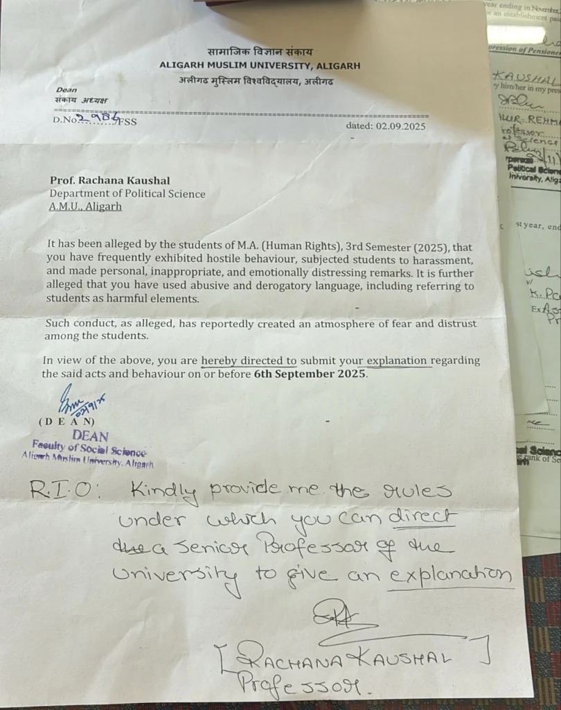 रचना कौशल – सितंबर 2025 की शुरुआत में मेरे पास डीन इकराम हुसैन से एक लेटर आया. जिसमें एमए की किसी स्टूडेंट की शिकायत के आधार पर मुझ से सफाई मांगी गई थी. जिस शिकायत में लिखा था कि मैं क्लास में गलत भाषा का प्रयोग करती हूं, क्लास में दहशत का माहौल बनाती हूं और निजी कमेंट पास करती हूं.